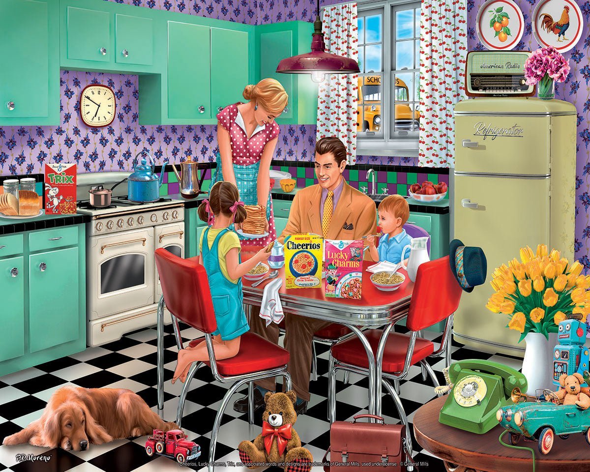 1675 Breakfast Table. It’s a quiet start to the day. As the family dog rests on the floor beside the table, mom serves dad pancakes and the kids eat their favorite cereal. Toys strewn about signify the kids had already begun playing before they were called to eat. It’s almost 7am which means the neighborhood is awake. A school bus passes by the kitchen window but the kids in this house are still too young to attend. Dads’ briefcase is on the floor near the phone so he can grab it on the way out the door. Artist P.D. Moreno allows us to have breakfast with the family in this vintage inspired 1000-piece jigsaw puzzle.