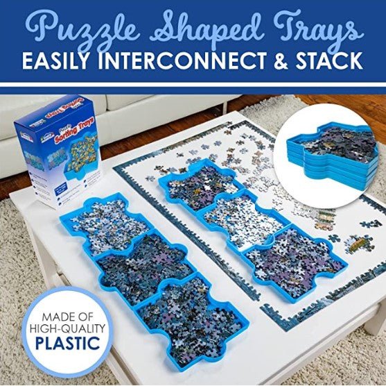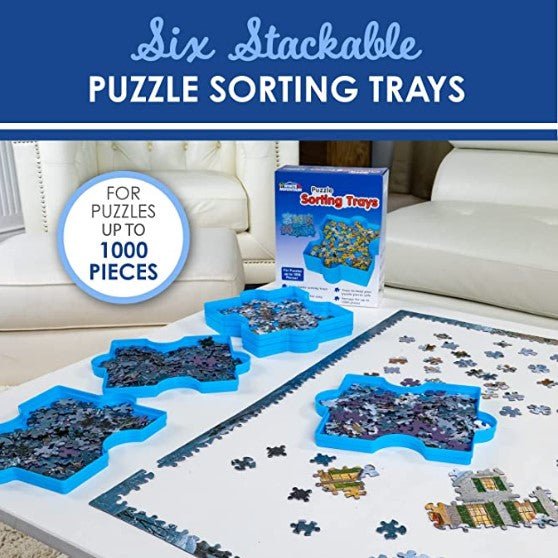 This Puzzle Sorting Trays is a brand new item for the dedicated puzzler to organize puzzle pieces by color or whatever your system is. The sorting trays includes six sturdy plastic trays shaped as puzzle pieces that nest into one another for easy stacking and puzzle piece storage, keeping your pieces sorted and your work area neat and safe from losing stray pieces.